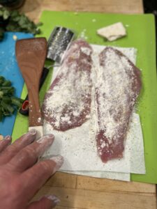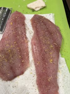 Salt and pepper each filet, zest a lemon onto the filets and pat into the fish. Dust with all-purpose flour