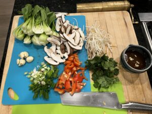 veg sit for a minute or so. Add the bok choy, green onion, and garlic and saute with mushrooms. Add