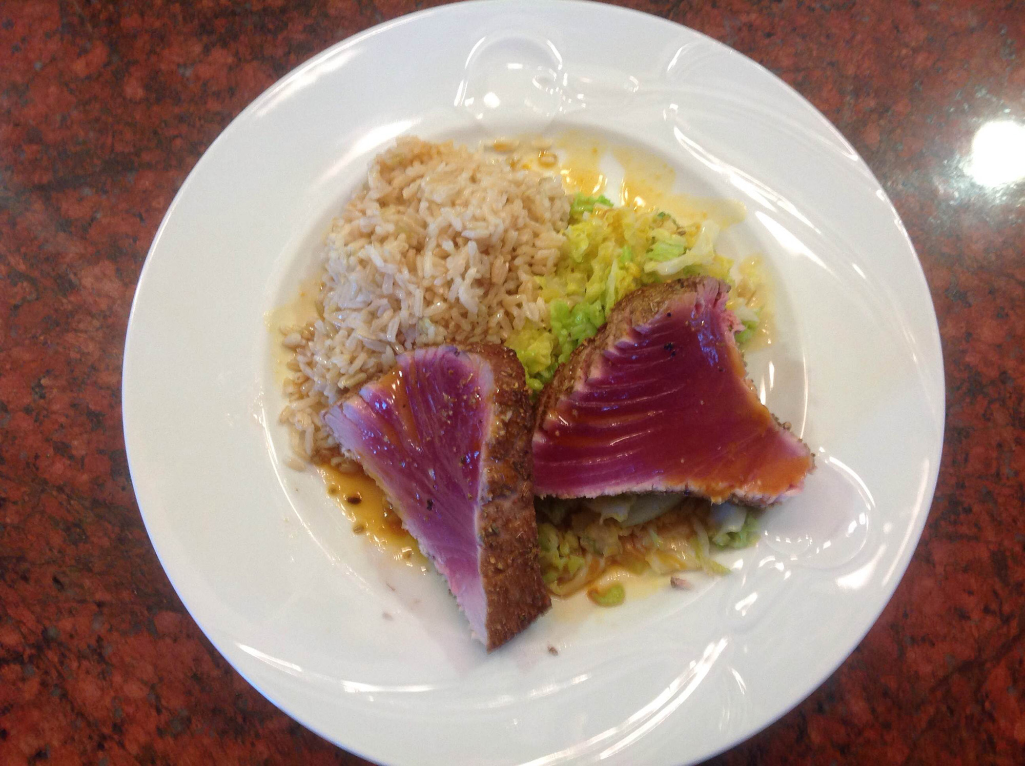 FENNEL-CRUSTED TUNA with WILTED CABBAGE and ORANGE-SOY SAUCE