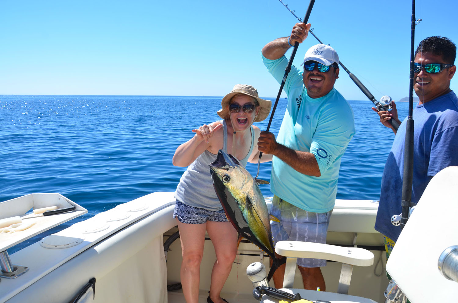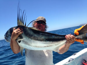 hoo, there were abundant, but were tough to land. Lots of bite offs and lost fish. Marlin were there too, but most anglers choose to target the game fish that were worth big bucks thanks to our sponsors. Rick Jensen from Sportfishing Financial was there with his family and donated $500 cash for the largest dorado or wahoo. Mark from “Team Mama, Papa and Juan” had a 24.5 pound wahoo on day 2 to take the money. Tournament director Dr Bob had a 23 pound dorado on day 3 that he thought would weigh more…but fell just short. Largest tuna honors went to Phil with “Team Wiskey Tango” for a 49.5 pound yellowfin. He earned $500 cash from Dave at Statewide Stripes. 1st place honors went to Larry and Judy and “Team Tag”. They combined a big variety of fish including Roosterfish, Amberjack, Snapper, Marlin and Tuna to take top honors and win the return trip to Rancho Leonero next year to defend their title. They fished 2 days with Jen Wren and the last day with Scorpion Sportfishing where they really slammed the big tuna to help them take top prize. “Team Wiskey Tango” took 2nd place and received gift cards from Fishermans Landing Tackle, and 3rd place was last year’s winner Steve and “Team Hai Karate”.
