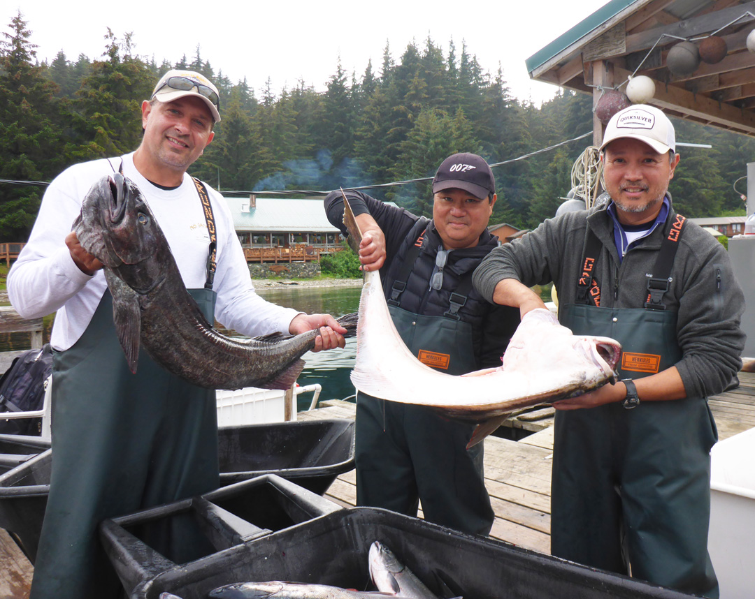 carlos-lollly-but   Perhaps the most prized catch of this trip was the black cod or sablefish.  We did not have the opportunity to target these delicious denizens of the deep last year, but after finally tasting them this past summer our group put these on top of our shopping list.  Captain Moe hooked us up with limits of black cod on our second day when brought us to his favorite black cod spot.  Unfortunately we had to fish deep around 600-700 feet and so it was hard work reeling up all that line.  The effort was worth it as we were able to load up on some nice sized cod.  Our biggest was Drew’s 20.5 pounder.  Since we were fishing with 2 hook rigs we were also able to bring up 2 fish several times, BOGO, buy one get one free deals if you will.   On our third day of fishing on the cod grounds, we heard some electrical noises coming from some nearby boats.  We thought they might have brought out some blenders to make some margaritas.  Later we found out some boats had electric reels for fishing deep.  Pete told us that the Lodge will try to equip all their boats with these next year.  Some may frown on these but they do have their place especially for helping the disabled, injured or someone that does not want to crank a reel for hours.  We ended up referring to these as the “set it and forget it” reels.  Just push a button and wait for the timer to go off.