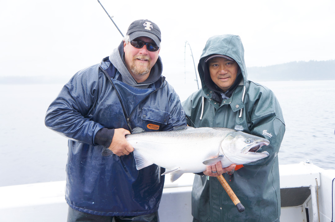Carlos- Manny big    First and foremost, the fishing was really good, as usual.  The Coho, or silver salmon, grew up a little this year.  The BananaBoysgrade was definitely bigger as several Mongo sized Coho were landed.  Peggy Topp boated one at 15 lbs. and Manny Gaudier landed probably the largest of the trip at 17lbs.  Our Captain Moe Neale could not stop admiring how thick it was and so he named it Mongo.  At first the fishing was on the slow side, however when nature called the bite began.  Our smaller boat did not have a head, or bathroom, and so we basically had to pee in a plastic coffee can in the back of the boat.  One of us had to go and the moment he pulled his pants down we had a triple jig strike on Cohos!  It sometimes does pay to get caught with your pants down.  Don’t worry ladies, the larger boats do have on board bathrooms.