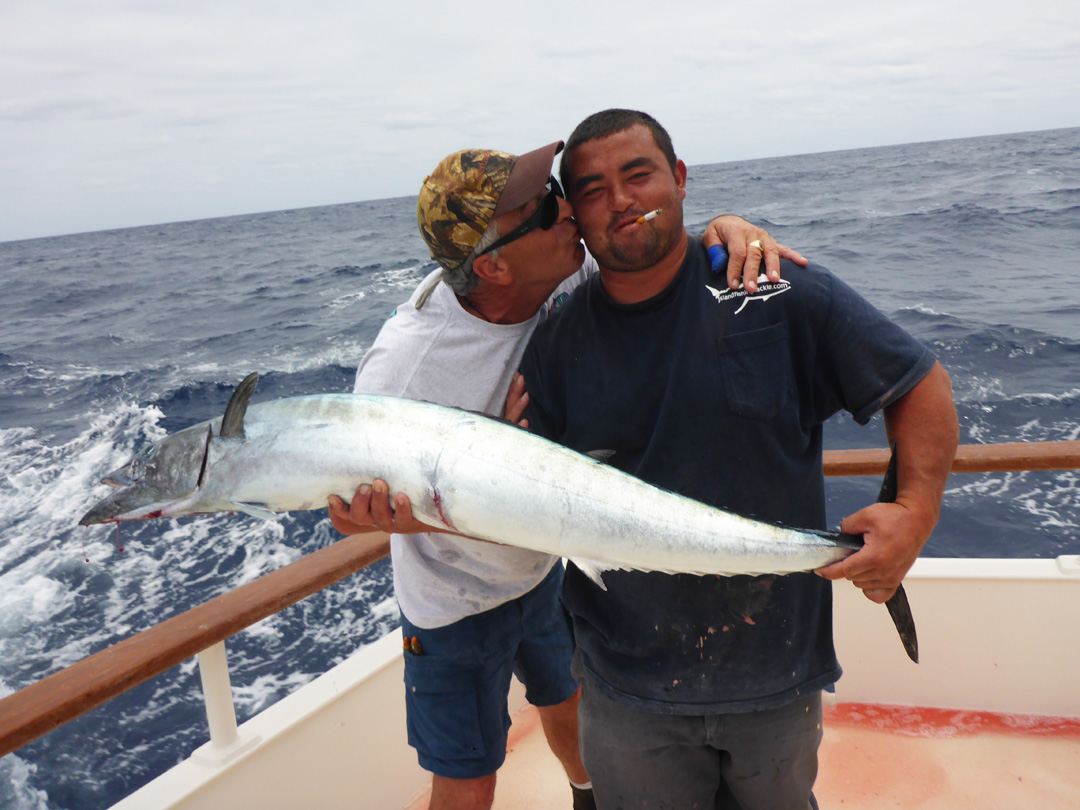 kite slowed and getting bit on sardine or puffers was challenging. We would have a shot on heavy sinkers near the bottom in the dark just before dawn, then almost nothing for the rest of the day. Captain Randy had seen enough at the bank and we made the 18 hour move the next morning to the “buffer zone” around Clarion Island. We arrived before dawn, made some “salami” mackerel and Mark Loman hooked a big one only to be attacked by ravenous sharks soon after. With nowhere else to go, we knew we had to make the best of this situation. Captain Randy, the crew and anglers battled tuna and sharks for the next 4 days. The area was loaded with tuna and a few wahoo. Had the sharks not been so plentiful, we would have had an epic trip. As it was w