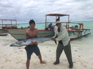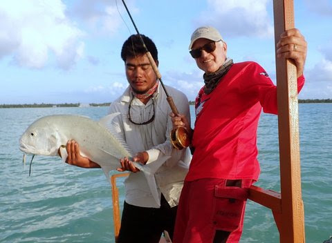 The following morning we transferred back to the Honolulu Airport for our noon flight to Christmas Island on Fiji Airways, the flight is 3 hours and 15 minutes. The atoll the second biggest is approximately 1500 miles due south and just north of the Equator. On our arrival at Cassidy Airfield we cleared immigration and customs as well as purchased our fishing licenses, as we exited we were met by hotel staff that loaded our baggage and transferred us to The Villages which is about a 1/2 hour ride. On arrival we were welcomed by the manager of the lodge, given a briefing on our stay assigned to our rooms and along with some of the local ladies sang a few island songs. At 6:00pm we gathered to meet our head fishing guide Ekist who briefed us on our fishing for the next 6 days. You have a choice as to what type of fishing you would like to do during your stay such as fishing the flats for bonefish and a variety of fish including the Giant Trevally (GT) or fishing offshore for tuna and wahoo and jigging for reef fish for a variety of fish. A normal fishing day is from6:30am to around 5:00pm. I always advise those on the trip who have never fly fished to definitely give it a try as the guides are excellent instructors and will have you casting a fly with accuracy to catch fish with in an hour.