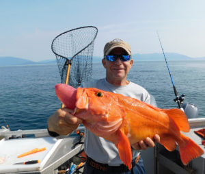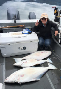 do with the crazy weather this summer. Whalers Cove had not had a drop of rain in 3 weeks…the water temperature was 62 degrees; the air was in the high 70’s. Great fishing weather but unusual. We still managed several salmon, but not our 6 fish per person limit which in previous years was the norm. Next up Captain Ethan suggested we target trophy halibut and ling cod. Fishing Shimano Flat Fall 160-gram jigs in 150 to 200 feet of water we managed to catch and release some amazing ling cod. We even had a “keeper” 34 ½ inch ling cod in the narrow slot limit of 30 to 35 inches….and everything else needs to be released. Rich Topp hooked into something large- after a prolonged battle on light gear we released a 64-inch halibut that was estimated at 140 pounds. We all had plenty of fish to take home, so the thrill of catching and releasing these monsters was great.