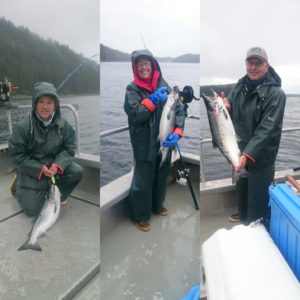 “Cause I’m a cowboy, on a steel horse I ride.  I’m wanted, wanted, dead or alive…”  2,129 miles south east of Dutch Harbor on the 32 foot Khalee Sue, in a season of good weather, calm seas,  and great fish counts, Captain Kevin Frank is rocking out with his awesome  crew of greenhorns Judy Kanouse, Manny Gaudier, Carlos Gaudier, and Drew Varos.  “That’s the way uh huh uh huh I like it” is playing in the back ground as the crew works in unison with the beat to retrieve double and triple hookups on Coho Salmon.  During a previous trip we even had “I like big butts and I cannot lie” on the radio while we were fishing for halibut, and that was no fluke.  Fishing up at Whaler’s Cove always puts a big smile on our faces as evident in our pictures.  Every time we go up, there is a particular Bon Jovi song and Discovery Channel show that always comes to mind.  However, unlike the tv show, this is probably one of the friendliest fishing experiences you will ever have.