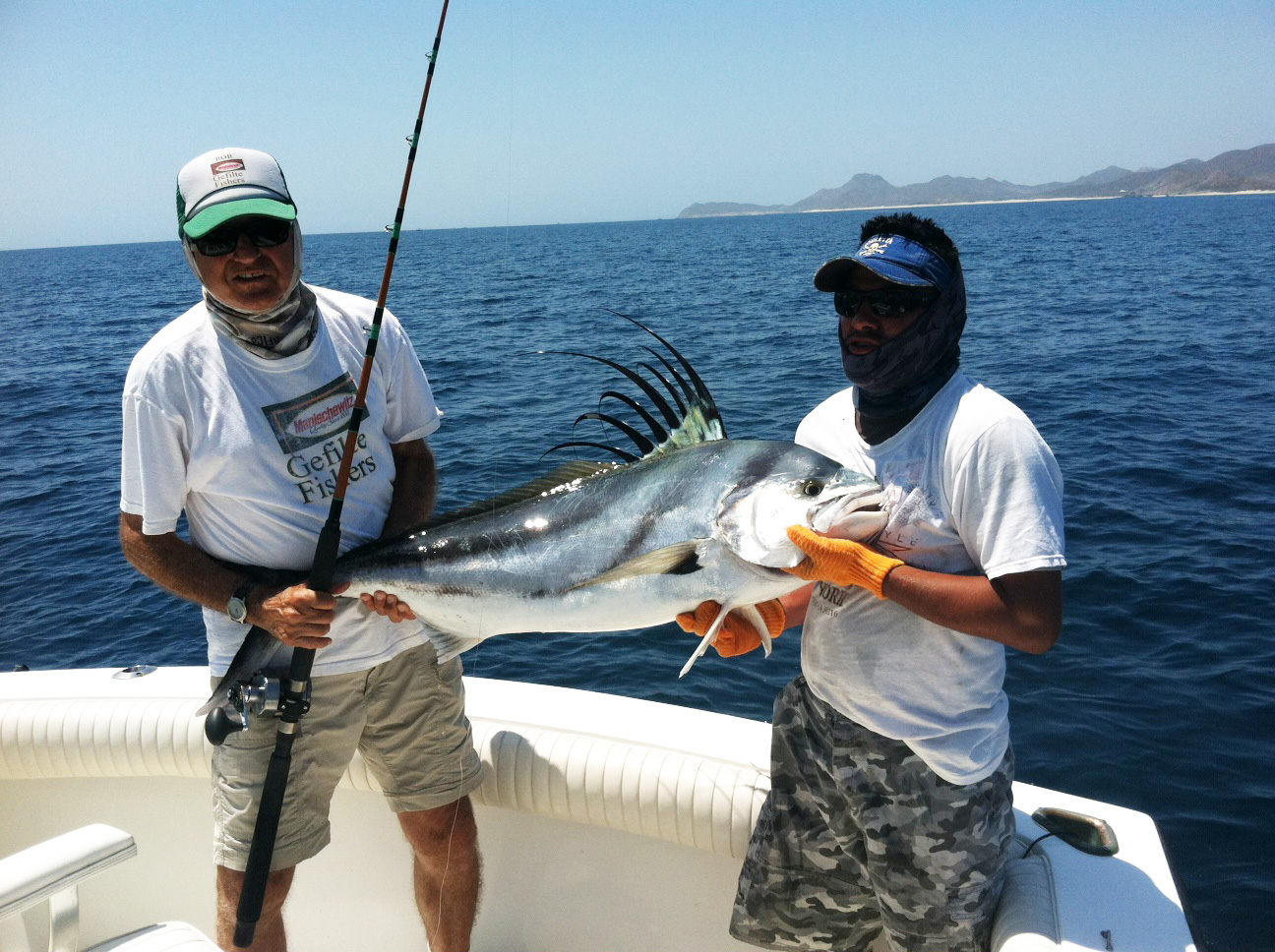 year the scores were very close. Our team, Team Gefiltefish, in spite of catching 8 marlin and a roosterfish on our two best days only finished in fourth place. If we had caught one more marlin on either day we would have won. When I let slip that I had “farmed” two marlin, Gary Barnes- Webb said, “You’re not a Gefiltefisher, you’re a Gefiltefarmer.”