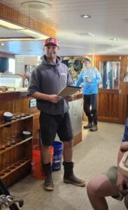 The 113 foot Royal Polaris left Dec. 9th on the Let’s Talk Hook Up 8 day trip with 30 excited anglers with high anticipation after witnessing the previous trip’s offload. Captain Trevon gave introductions of the crew, Eddie, Steve, Nicky, James ( Jimbo), Doug, Dustin, and Mike plus the safety meeting along with a preview of where he was planning to fish on this trip. Charter Master Wayne handed out and raffled sponsored gifts from Aftco, Gamakatsu, Shimano, Seaguar, and Costa plus various stickers and terry cloth towels. Dustin and Mike in the galley prepared a quick lunch for everyone and then everyone started assembling their gear.