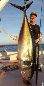 After a smooth overnight run heading south, we were in the zone the first morning. With this being the first trip for the Royal Star to this territory there would be some scouting around. Captains Brian Simms and Tim Ekstrom had already plotted out the ridges and temperature charts. That afternoon, they spotted out a huge school of jumping dolphins. We worked that area for the next few hours. The results were 73 yellowfin tuna, most all in the 30 to 40 pound range. This was the kind of warm up that you want for a trip. We all seemed to have 6 to 8 tuna each. This would have been a nice catch for many trips, but we left the area in search of bigger and better. At least this stop assured we would all go home with some nice fish.