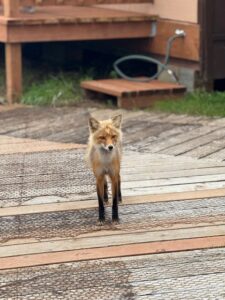 But bears are only part of the scene. Beavers ply the quiet backwaters, creating their lodges and shaping the flow of creeks and side channels. Overhead, bald eagles circle, their sharp cries piercing the silence as they scan for fish. And at Katmai Lodge itself, a small family of red foxes has made the property their home, often seen trotting between cabins or curiously peering in at guests, embodying the wild charm of the place.